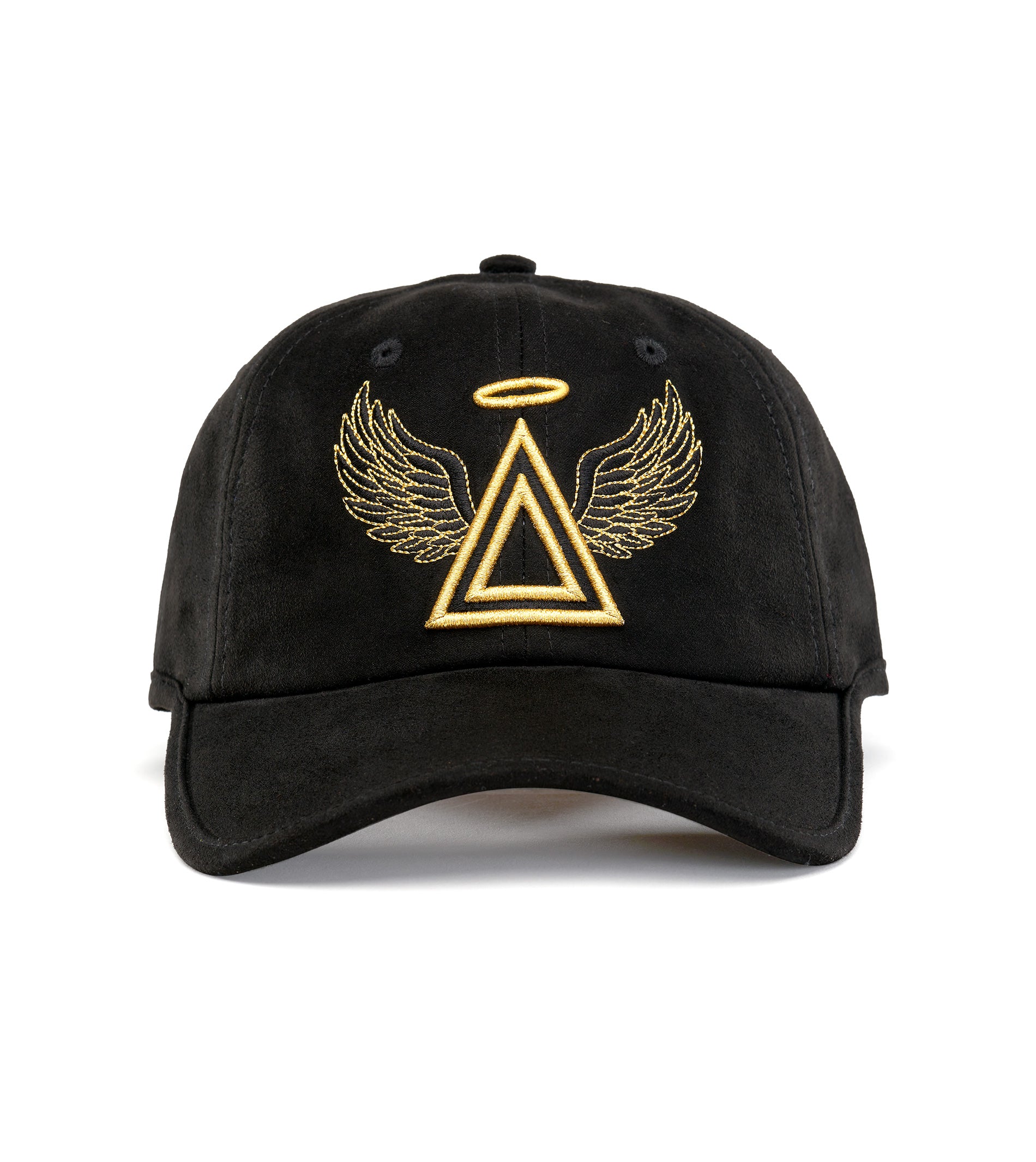 Unstructured Suede DAD HAT is distinguished by our embroidered Logo with ANGELS remix at front, back & sides. Adjustable back strap, Embroidered ventilating grommets, Black Suede, Gold embroidery & Satin Lining with angels Art.