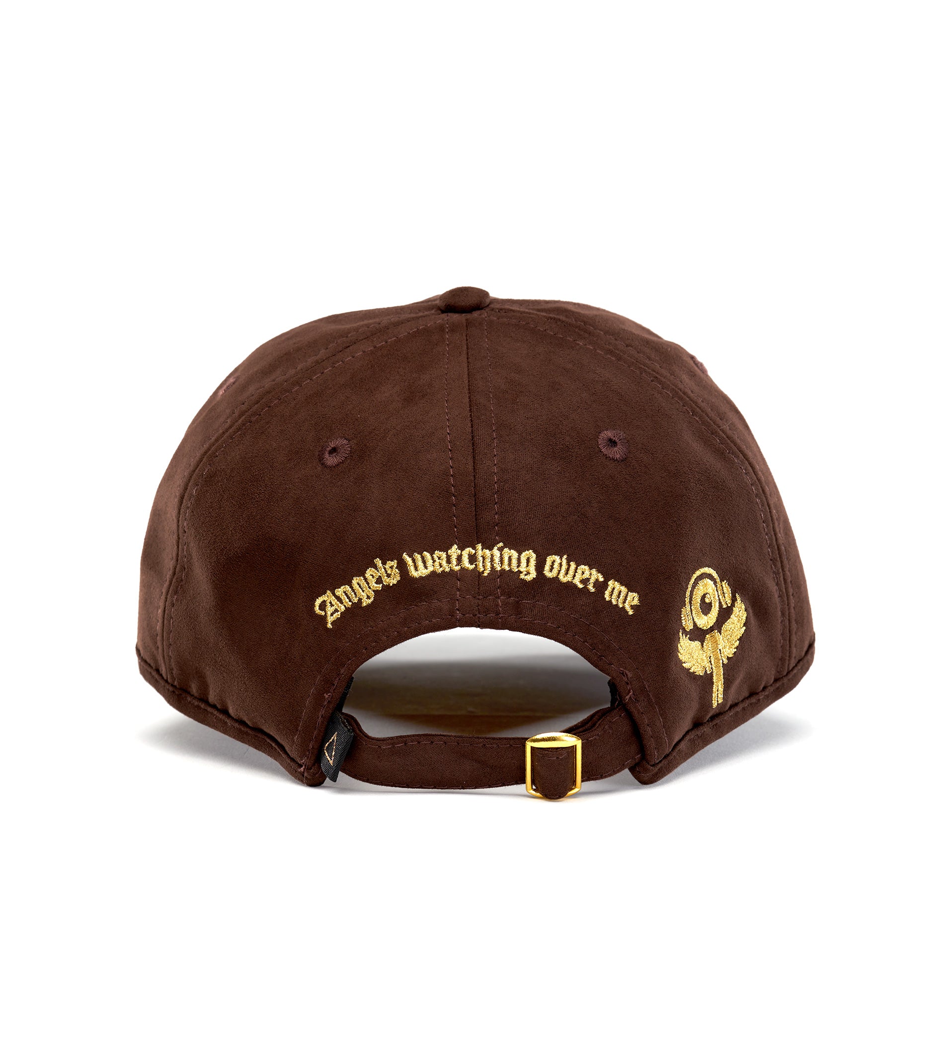 Angels Capsule, one of five colors. This rich Brown Suede dad hat has our signature embroidered Logo with a heavenly remix at front, back & sides. Adjustable back strap Embroidered ventilating grommets,Brown Suede, Gold embroidery & Satin Lining with angels Art.