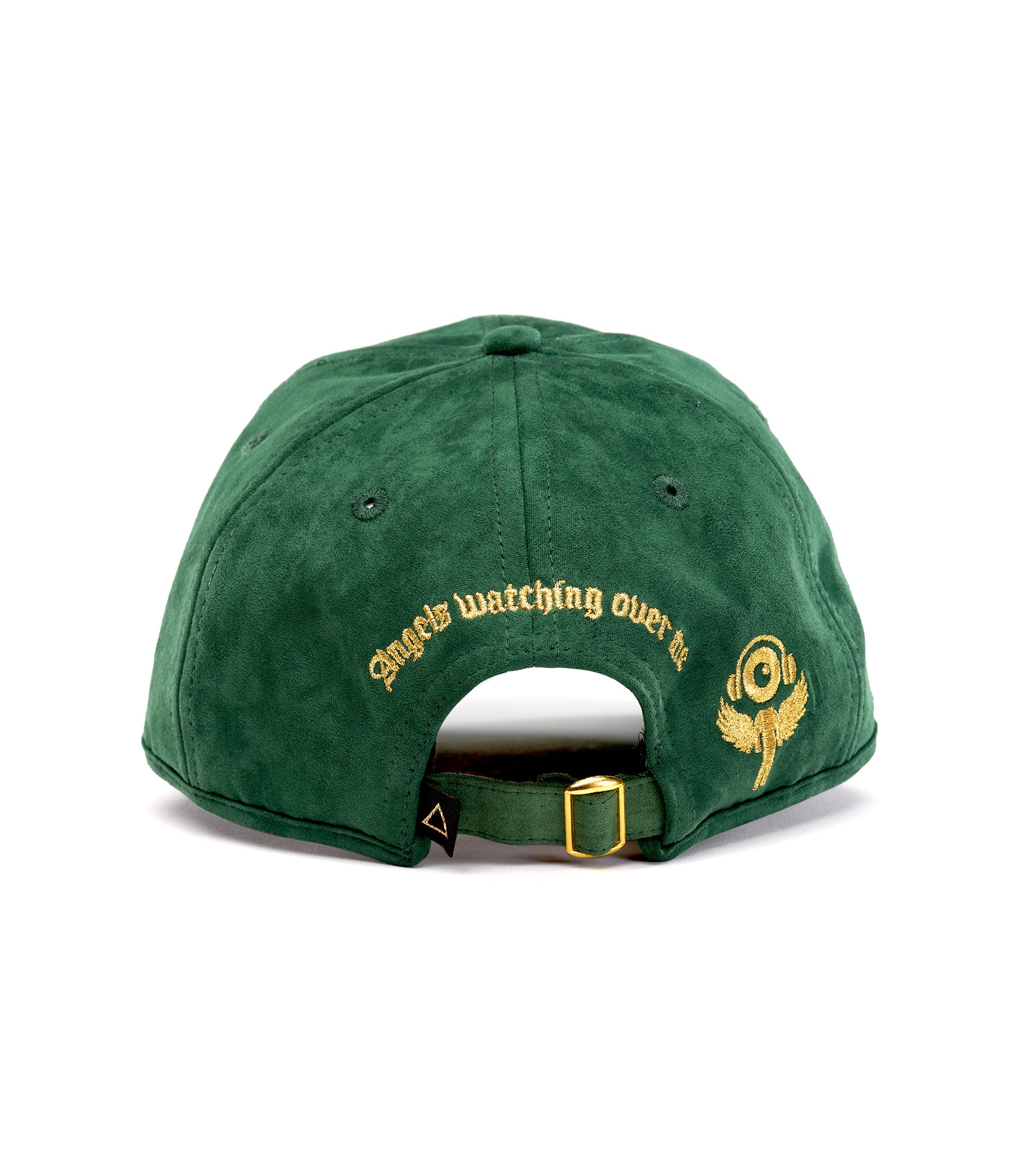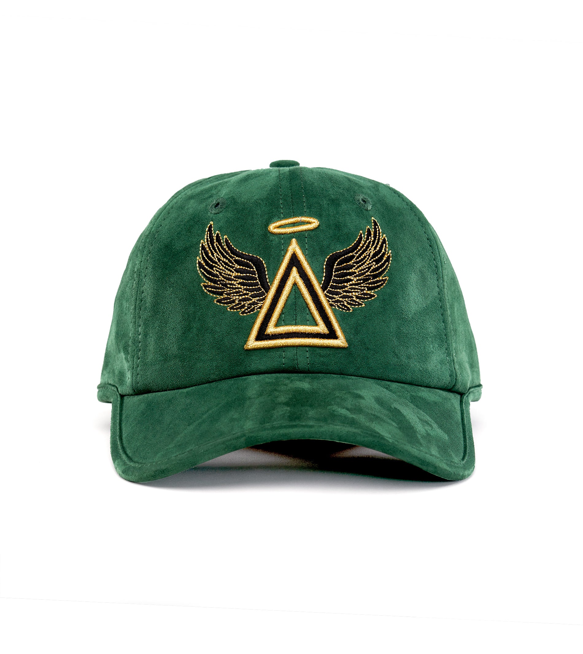 Unstructured Suede DAD HAT is distinguished with Trianguloswag's signature embroidered Logo with a ANGELS remix at front, back & sides. Adjustable back strap Embroidered ventilating grommets,Green Suede, Gold embroidery & Satin Lining with angels Art.
